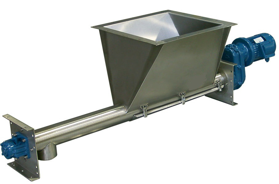 Винтовой питатель: В конструкцию винтового питателя входит желоб или труба, шнек, подшипниковые опоры и привод. Винт вращается благодаря встроенному мотор-редуктору, за счет чего груз перемещается вдоль желоба или трубы. Такие питатели монтируются перед дозаторами, промежуточными емкостями, смесителями. Модели отличаются от аналогов обширным диапазоном регулировок, оригинальной конструкцией уплотнений и подшипниковых узлов, простотой обслуживания.
